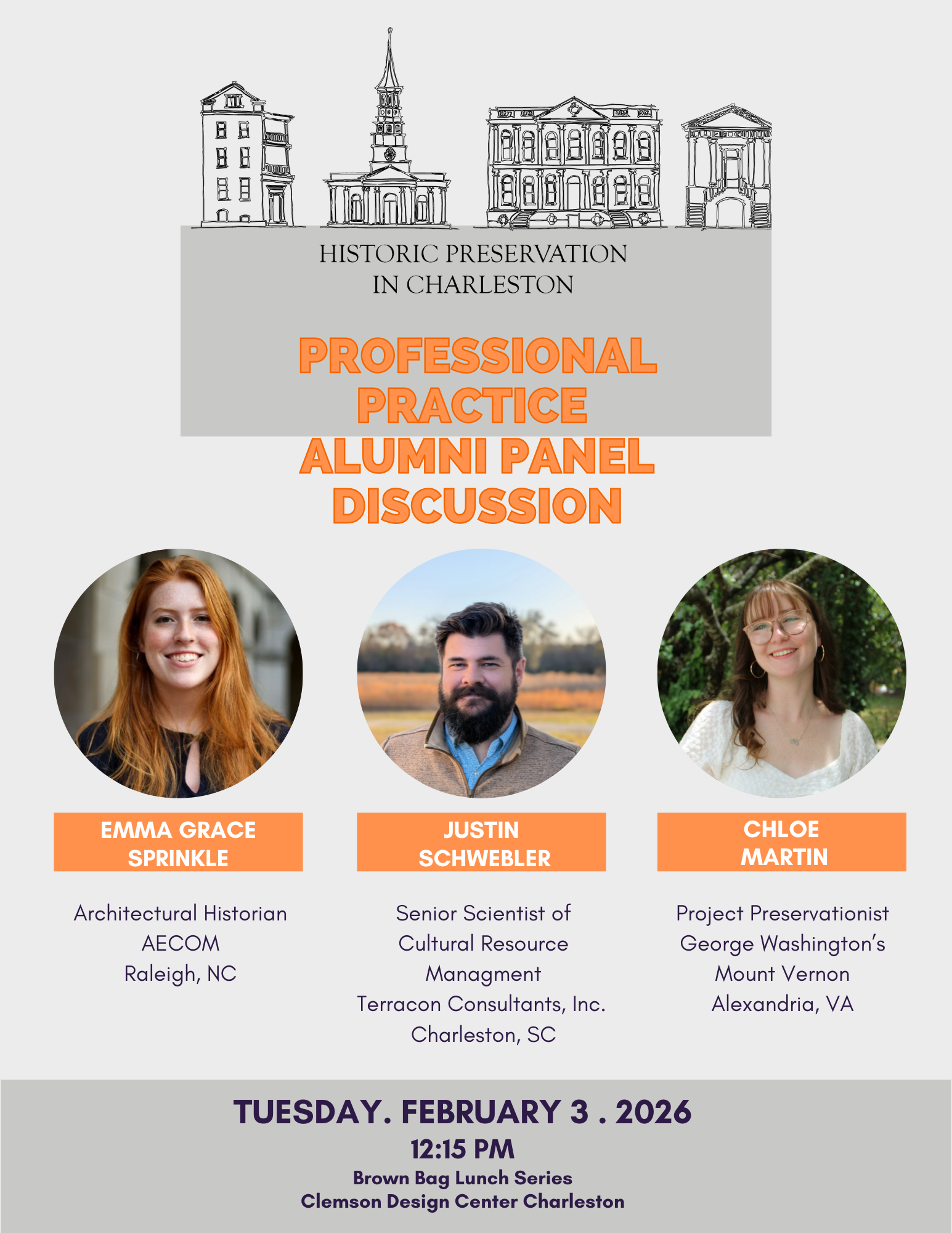 Clemson Design Center Charleston 701 East Bay Street, Charleston, SCMSHP Brown Bag Lunch Series-Professional Practice: Alumni Panel Discussion Overview We’ll be...